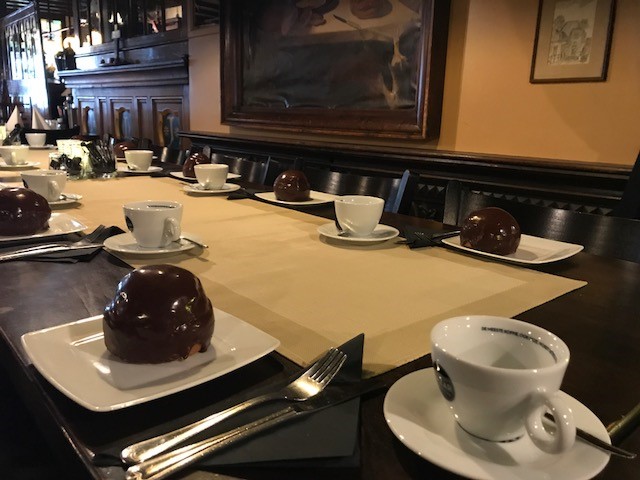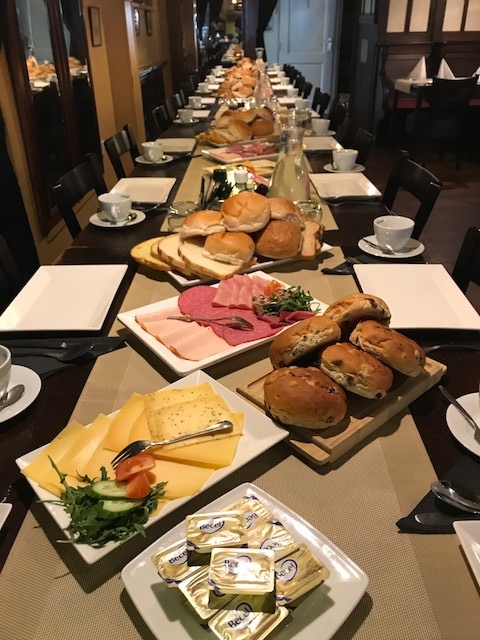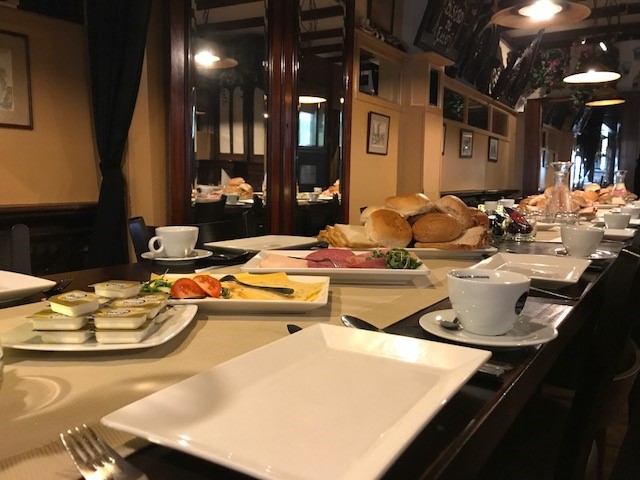 Gedekte koffietafel met per persoon: 1 zacht wit broodje, 1 zacht bruin broodje, diverse sneetjes brood, een krentenbolletje, oude kaas, jonge kaas, achterham, kipfilet, servelaatworst, diverse jam soorten en hagelslag. Tijdens de lunch word 1 uur lang onbeperkt koffie en thee geschonken. Ook wordt er per persoon een rundvlees kroket geserveerd.