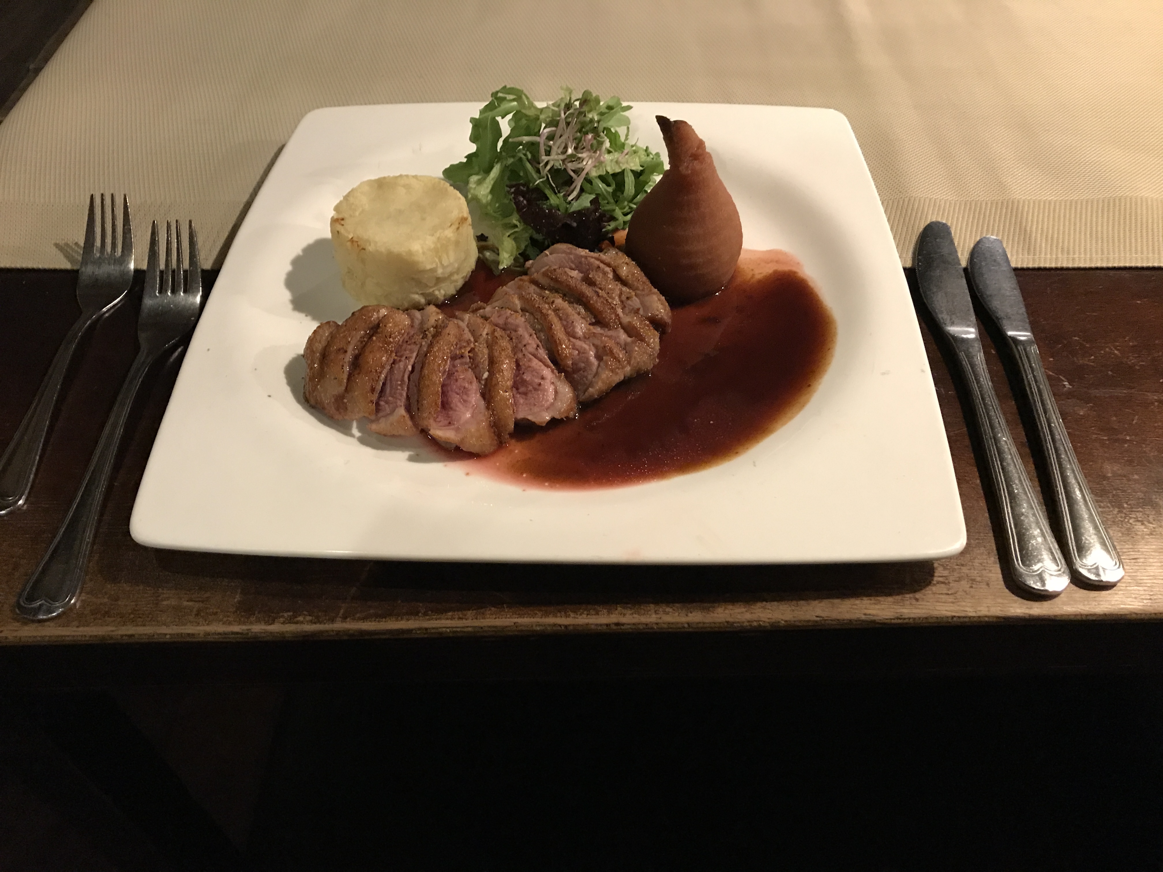Zalmmousse/ pangafilet/ witte wijnsaus/ groenten.