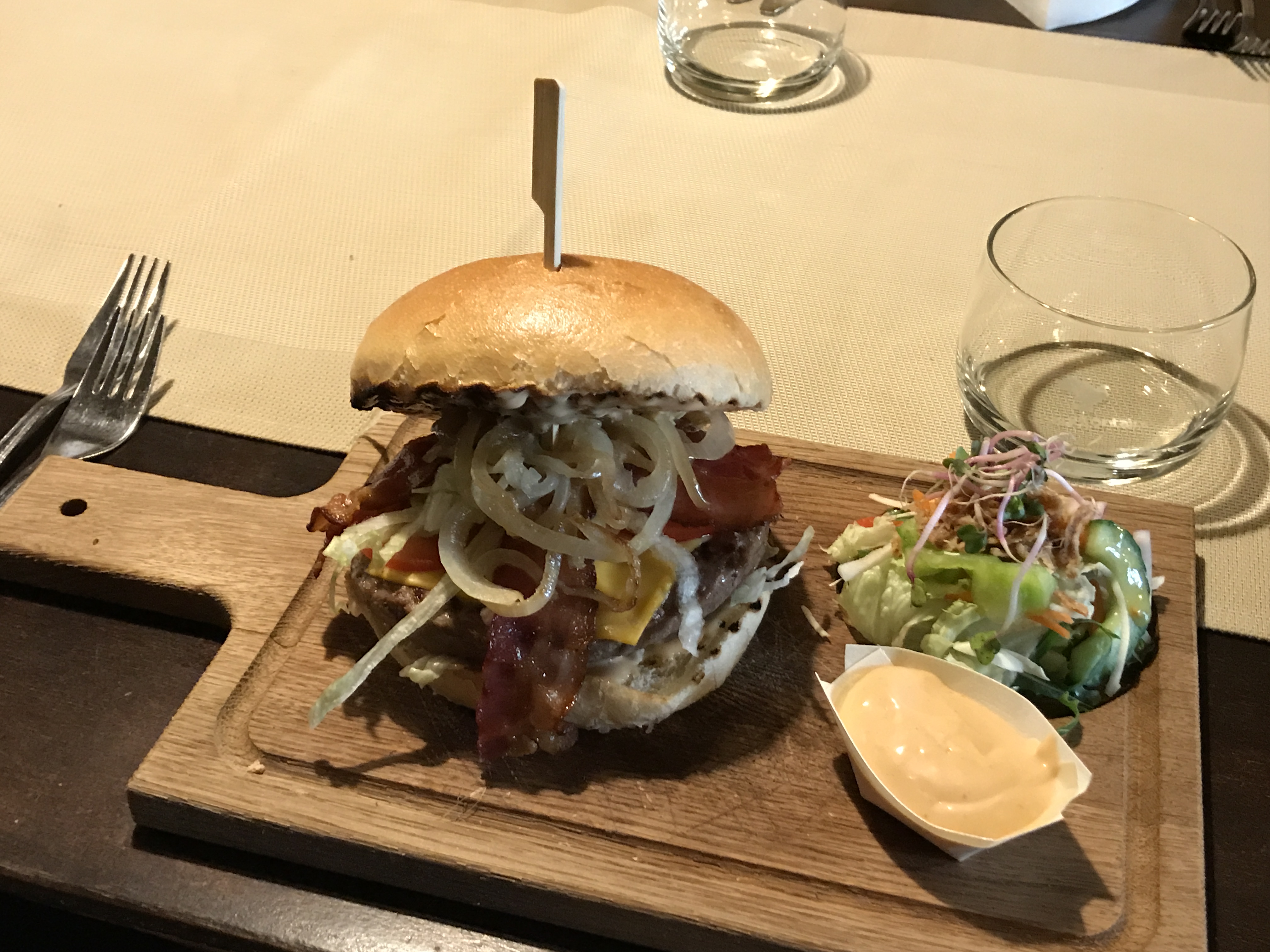 gegrild/ broodje/ uitgebakken spek/ cheddar/ tomaat/ salade/ ui.